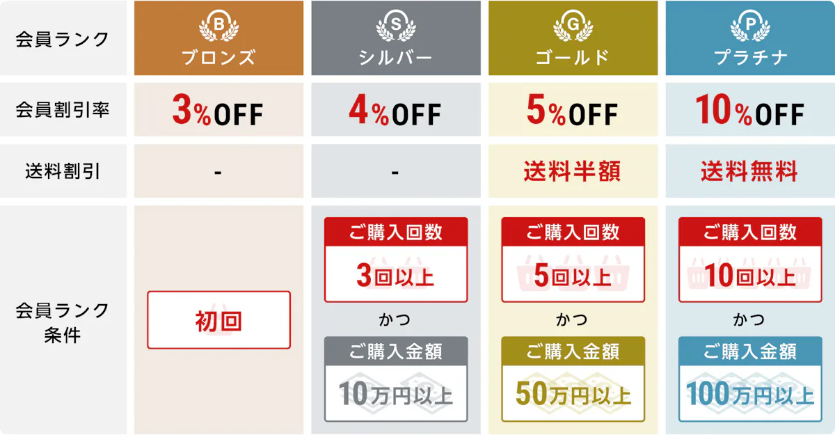 ご購入回数・ご購入金額によって会員ランクが上がり、割引率がアップします。